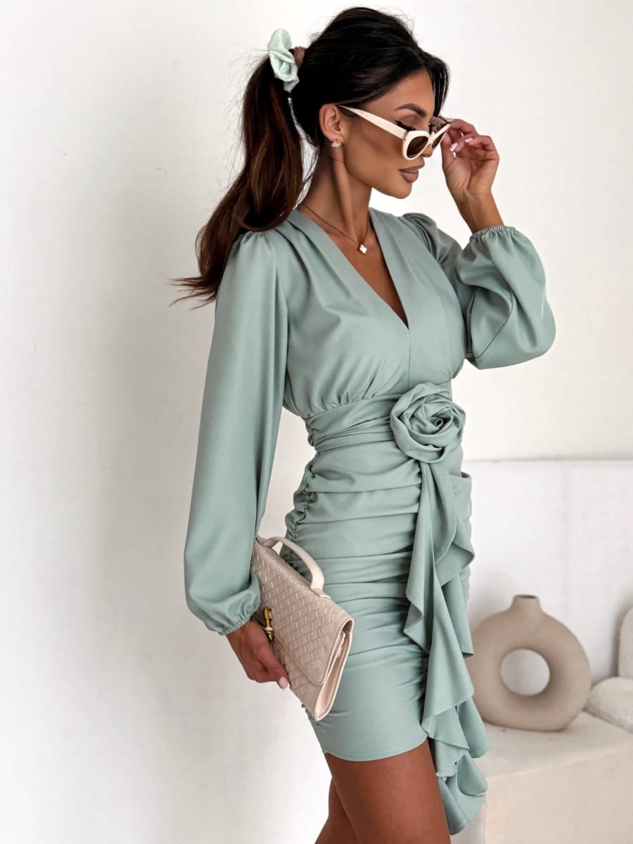 Sukienka Bella Rose – Pistacjowa z Efektownym Marszczeniem i Różą